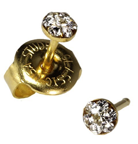 Studio : Studex Publisher : Studex Binding : Misc. Product Description SHORT POSTED - 3/16 inch (regular length post is 1/4 inch) One brand new pair of Studex System 75 hypoallergenic, 24kt gold electroplate surgical stainless steel ear piercing studs with backs. These earrings are adorable 1/8 Inch clear crystal daisy with clear center. Earrings are also easily removed from the self-piercing cartridge for wear in already-pierced ears. Perfect for every-day use! They come to you packaged in a sealed, sterilized blister package fresh from the Studex factory. Works only with Studex System 75 ear piercing gun for piercing - gun not included. Thin 20 gauge posts like regular earrings. Made in the USA. Studex System 75 offers the safest ear piercing available today. Every piercing stud, hoop and instrument meets or exceeds all US FDA and EC European standards and regulations. All Studex studs and hoops are hypoallergenic, nickel-safe, lead-, cadmium- and cobalt-free. They meet or exceed European Union standards and FDA regulations (U.S. Food Drug Administration). Color may vary slightly due to the color calibration of each individual monitor. The photo does not show actual size, please refer to description for size details. 0