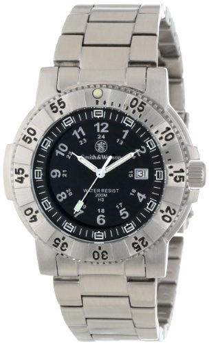 -. Binding : Watch -. Brand : Smith & Wesson -. Department : mens -. EAN : 5055732407929 -. Feature : Water resistant to 200-meters (660-feet) / Scratch resistant hardened mineral glass crystal protects the dial of the watch / Features precision quartz Swiss component movement / Includes (3) hands to show the hours, minutes and seconds / Comes with a 1-year limited warranty -. IsAutographed : 0 -. IsMemorabilia : 0 -. Label : Smith & Wesson -. LegalDisclaimer : The Smith & Wesson Aviator Watch features Tritium illumination that won't fade during the night, as traditional phosphrous illuminaton watches do. The heavy duty water resistant case is made of stainless steel and is factory tested to 200 meters. The Commander features a matching heavy duty stainless strap and scratch resistant mineral glass crystal. -. Manufacturer : Smith & Wesson -. Model : SWW-357-SS -. MPN : SWW-357-SS -. NumberOfItems : 1 -. PackageQuantity : 1 -. PartNumber : SWW-357-SS -. ProductGroup : Watch -. ProductTypeName : WATCH -. Publisher : Smith & Wesson -. Studio : Smith & Wesson -. Title : Smith & Wesson Men's SWW-357-SS Aviator Tritium H3 Stainless Steel Strap Watch -. UPC : 000000058780