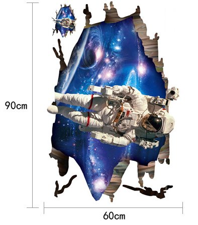 -. Binding : Toy -. Brand : ufengke décor -. EAN : 0702646967623 -. Feature : Applies to any clean/dry/flat surface / Easy to apply, remove and reuse without leaving damage or residue / Comes in 1 sheet, sheet size: 60cm x 90cm(23.6" x 35.4") / Recommend finished size: 0.89(W) x0.582m(H), it can also be adjusted according to your preference -. Label : Ufingo -. Manufacturer : Ufingo -. Model : UF-WL1354 -. MPN : UF-WL1354 -. PartNumber : UF-WL1354 -. ProductGroup : Toy -. ProductTypeName : TOYS_AND_GAMES -. Publisher : Ufingo -. Studio : Ufingo -. Title : ufengke® Creative 3D Damaged Wall Outer Space Astronauts Wall Decals, Children's Room Nursery Removable Wall Stickers Murals -. UPC : 702646967623