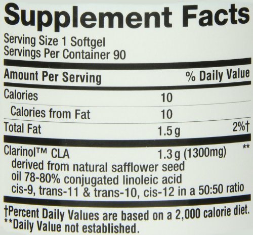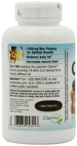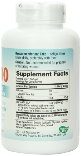 -. Binding : Health and Beauty -. Brand : Nature's Way -. Department : Health and Beauty>Health and Wellness -. EAN : 0885367114993 -. Feature : Nature's Way -. IsAdultProduct : 0 -. IsAutographed : 0 -. IsMemorabilia : 0 -. Label : Nature's Way -. LegalDisclaimer : * These statements have not been evaluated by the Food and Drug Administration. This product is not intended to diagnose, treat, cure or prevent any disease. ** Always refer to the manufacturer's label on the product for description, recommended dose and precautions. -. Manufacturer : Nature's Way -. Model : 15341 -. MPN : 15341 -. NumberOfItems : 1 -. PackageQuantity : 1 -. PartNumber : 15341 -. ProductGroup : Health and Beauty -. ProductTypeName : HEALTH_PERSONAL_CARE -. Publisher : Nature's Way -. ReleaseDate : 2010-05-13 -. Size : 90 -. Studio : Nature's Way -. Title : Nature's Way CLA -1300mg, 90 Softgels -. UPC : 794628215051