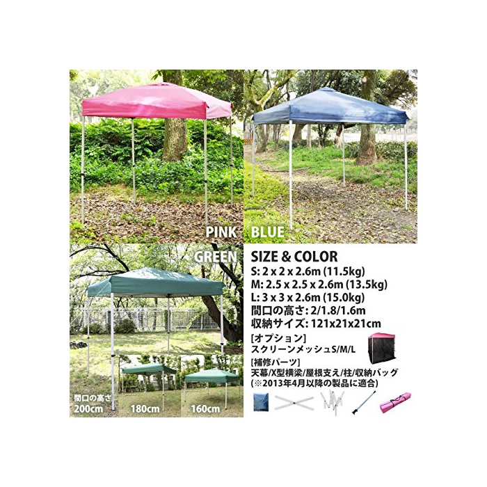 텐트의 사이즈: (S) 200cm×200cm×260cm (M) 250cm×250cm×260cm (L) 300cm×300cm×260cm (전사이즈 공통)[정면의 폭의 높이] 200cm/180cm/160cm [수납 시] 21cm×21cm×121cm