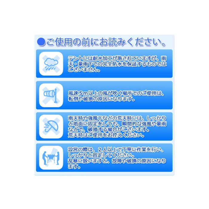 재질:【텐트】[텐트 원단] 폴리에스텔 ※PU도장(PVC도장 보다 경량으로 변색하여 어려운)에 의하 UV코팅/발수 방수 가공필한 것을 옥스포드 짜고 마무리했습니다 [지주 뼈대] 스틸 [조인트부] 플라스틱