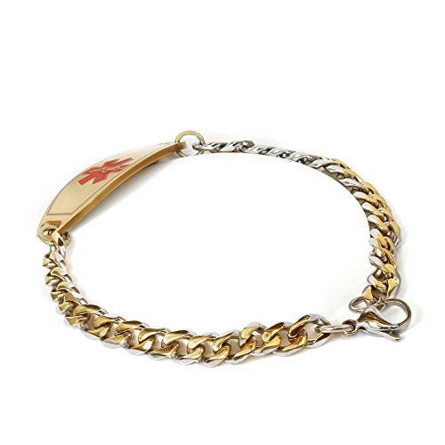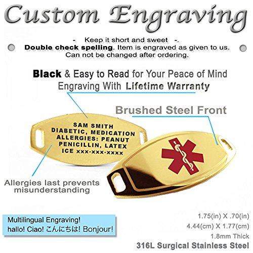 -. Binding : Jewelry -. Brand : My Identity Doctor -. Department : womens -. Feature : BLACK & EASY TO READ: Custom medical bracelet; Black engraving highly recommended. Lifetime Warranty / ENGRAVING: 1.Medical condition 2.Medication/Allergies 3.ICE Contact Number; Engraved as received / SIZING: Order exact size at small part of wrist. See photo. Ext links incld can be resized locally / IMPORTANT: Check spelling & phone numbers when ordering medical bracelet. Order cannot be changed / Medium non allergenic gold tone; teen & adult; 316L non corrosive; Bracelet 7mm Tag 4.4cm x 1.1cm -. Label : My Identity Doctor -. Manufacturer : My Identity Doctor -. Model : i1CD-BSG1-CST-W -. MPN : i1CD-BSG1-CST-W -. PackageQuantity : 1 -. PartNumber : i1CD-BSG1-CST-W -. ProductGroup : Jewelry -. ProductTypeName : FASHIONNECKLACEBRACELETANKLET -. Publisher : My Identity Doctor -. Studio : My Identity Doctor -. Title : MyIDDr Custom Engraved Medical Bracelet Gold Toned 316L Stainless Steel, 7mm
