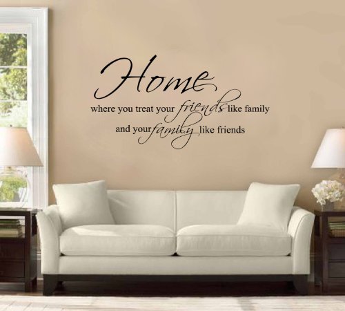 -. Binding : Kitchen -. Brand : WallPressions -. Color : Black -. EAN : 0700465018007 -. Feature : Color: Matte Black / Size: 42" x 22" approximately / High-Quality Die-Cut Oracal Vinyl / Removable and won't damage walls; Non Transferrable / Written and Video Instructions included -. Label : Wall Pressions -. Manufacturer : Wall Pressions -. MPN : Wal-9652 -. PackageQuantity : 1 -. PartNumber : Wal-9652 -. ProductGroup : Home Improvement -. ProductTypeName : HOME -. Publisher : Wall Pressions -. Studio : Wall Pressions -. Title : 42" Home Is Where You Treat Friends Like Family and Family Like Friends Large Wall Decal Sticker Quote Home Decoration Decor -. UPC : 700465018007