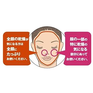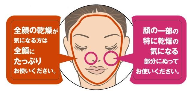 全顔の乾燥が気になる方は全顔にたっぷりお使いください。 顔の一部の特に乾燥の気になる部分にぬってお使いください。