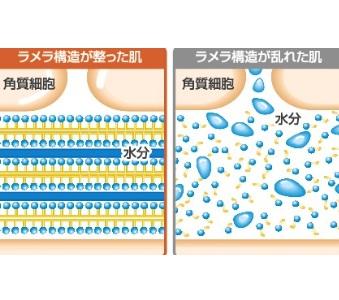 乾燥肌や荒れた肌では、肌深部のラメラ構造が乱れ、肌でうるおいキープできなくなってしまうことで、乾燥が起こりやすくなります。
