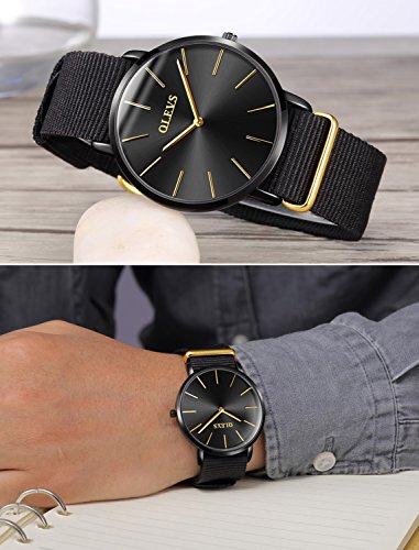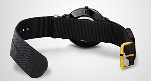 - Canvas Couple Wrist Watch: This model of watch is design with pure black canvas and black dial, simple and cool color. Combine with gold pointer and number, which display your noble temperament. This watch is no only a watch ,it express your taste and style. As you could feeling, the overall feeling of this watch is simple and clear. I love it for a big face, clear watch dial and pure black band.