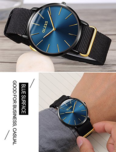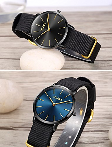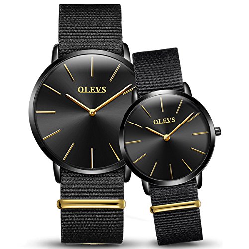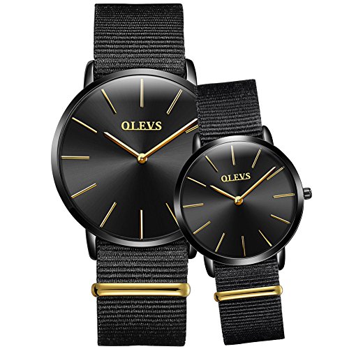 OLEVS Watches 2pcs Couple Set Nylon Strap Big Face Dress Quartz Wrist Watch,Blue/Black Dial Pure Black Canvas Band Watch