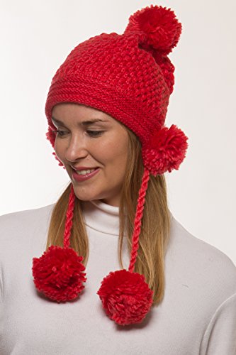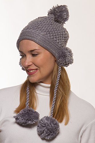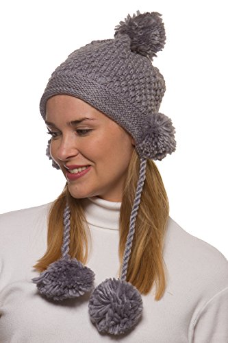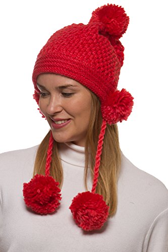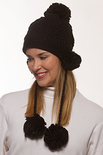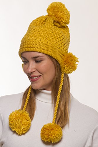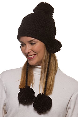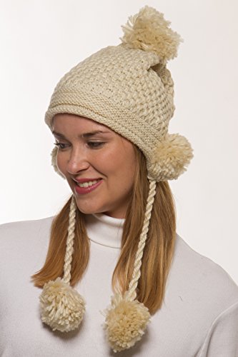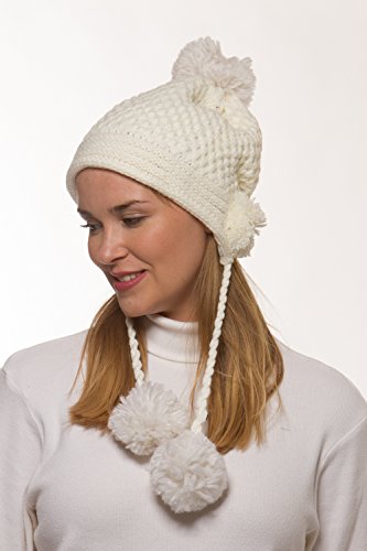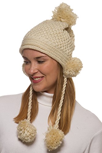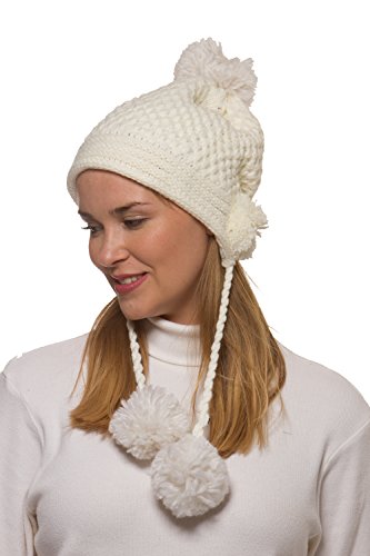 Binding : Apparel Product Description Women's winter crochet knit hat is a fashionable addition to your outerwear! 100% acrylic knit yarn prevents the beautifully detailed crochet knit from losing its strength for the perfect fit all season long. 5 fuzzy pom-poms add a fun, playful look. One is located at the top and one is located on each side to give extra protection to your ears from the cold. Additional pom attached at the end of corded tie drawstring. This warm winter beanie makes the perfect gift for you or someone you love. 0