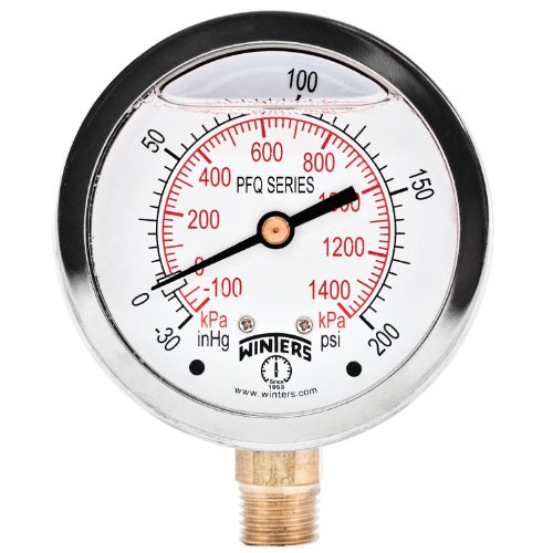 Winters PFQ Series Stainless Steel 304 Dual Scale Liquid Filled Pressure Gauge with Brass Internals, 30" Hg Vacuum-0-200 psi/kpa,2-1/2" Dial Display, +/-1.5% Accuracy, 1/4" NPT Bottom Mount