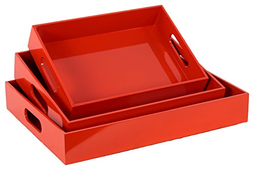 Wood Rectangular Serving Tray with Cutout Handles Set of Three Coated Finish Red Orange
