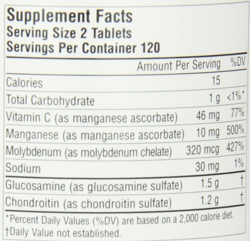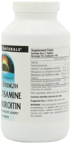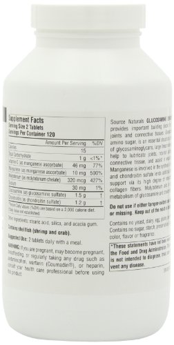 ReleaseDate : 2006-06-21 Studio : Source Naturals Publisher : Source Naturals Binding : Health and Beauty Product Description Dietary supplement. 50% More potent. Promotes healthy joints. Source Naturals Glucosamine Chondroitin provides important building blocks for healthy joints and connective tissues. Glucosamine, an amino sugar, is an essential structural component of glycosaminoglycans, large linear molecules that help to lubricate joints, nourish cartilage and connective tissue, and assist in wound healing. Manganese is involved in the synthesis of collagen, and chondroitin sulfate lends additional structural support via its high degree of interaction with collagen fibers. Molybdenum aids in complete metabolism of glucosamine and chondroitin. (These statements have not been evaluated by the Food and Drug Administration. This product is not intended to diagnose, treat, cure or prevent any disease.) Contains no yeast, dairy, egg, gluten, soy or wheat. Contains no starch, preservatives, or artificial color, flavor or fragrance. 0