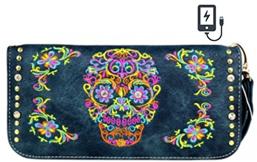 -. Brand : Montana West -. Department : womens -. Feature : Phone charging power source to charge all your devices. Cord included for powerbank. Battery life approx. 4-5 hours. Powerbank rechargable. / Sugar Skull Floral design with Silver and crystal studs. / A zipper enclosure for the entire wallet - Multi-card slots and 2 long slot compartments / Button Closure pocket at the back with powerbank. Detachable crossbody chain strap included. / 8.5" x 1.05" x 4.25" (Chain Strap 46") - PU Leather - Image colors for views other than front are for reference only. Phone is for reference is not included -. PackageQuantity : 1 -. ProductGroup : Shoes -. ProductTypeName : HANDBAG -. Title : Montana West Sugar Skull Phone Charging Convertible Clutch Wristlet, Crossbody