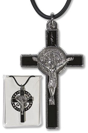 -. Title : Religious Catholic Gift 2 Inch Black Enamel Saint St Benedict of Nursia Crucifix Pendant with 18 Inch Rubber Cord Chain and Prayer Card