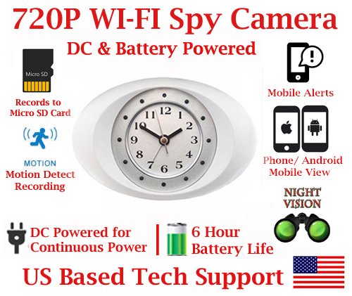 -. Feature : Well built Spy camera, All original Clock Features work. Night Vision with Invisible IRs. / 720P HD 1280x720 Resolution @ 30 FPS, Time and Date Stamped. Night Vision. / Connects to your WiFi & Internet, Easy setup P2P, view on iPhone or Android phone locally or Worldwide, . / Turn on the switch, Auto start recording in 1 minute, Supports Up to 64GB Mirco SD Card, DC Powered. / FREE US BASED TECH SUPPORT!!! Easy to use, 100% Plug-n-play for local recording and Wi-Fi setup, no complex setup required.