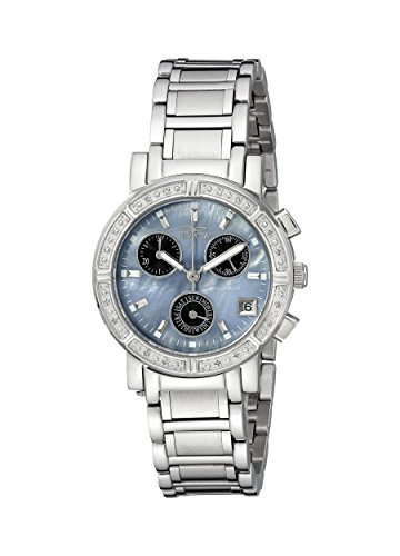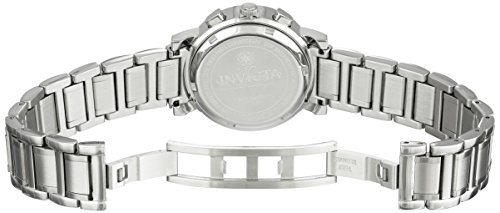 With 16 genuine white diamonds glittering on its bezel and a light-catching blue mother-of-pearl dial, the Invicta Women's Angel Collection Diamond-Accented Chronograph Watch is simply stunning. This elegant timepiece features a durable flame-fusion crystal to protect a brushed and polished stainless steel case and bracelet, as well as chronograph functions with 60-second, 30-minute and day-of-the-week black subdials. Precise Swiss quartz movement lends reliability and accuracy, while water resistance to 330 feet (100 meters) guards against wear and tear. For comfort and a secure fit, this watch closes with a sturdy deployment clasp. For added convenience, it arrives in a bright yellow Invicta box for easy storage and gift-giving.Feature