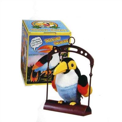 Colorful toucan records speech with the touch of a button while sitting on a hangable perch. The beak moves and the wings flip as it repeats what you say! A fun gift for young and old! Primary body and wing color may vary. Black is shown, red and green not shown. Requires 6 "AA" batteries.Feature