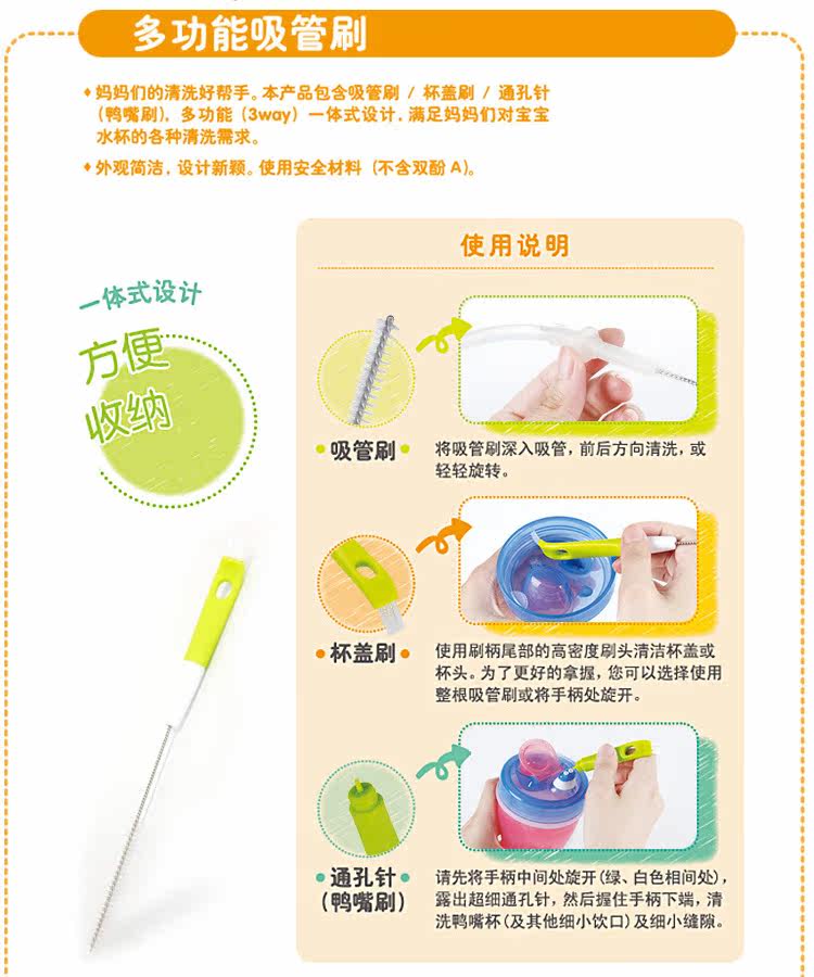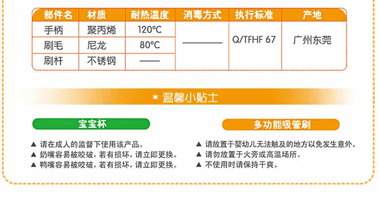 | 1.在每次使用前,应彻底将产品洗净并消毒,并确保没有破损或软化的迹象。 2.若吸管有磨损、损坏或刺破,请立即更换。 3.使用吸管时,若往杯中倒入热饮,可能会使液体从吸管中喷出而造成烫伤。 4.始终在成人的监督下使用。 |