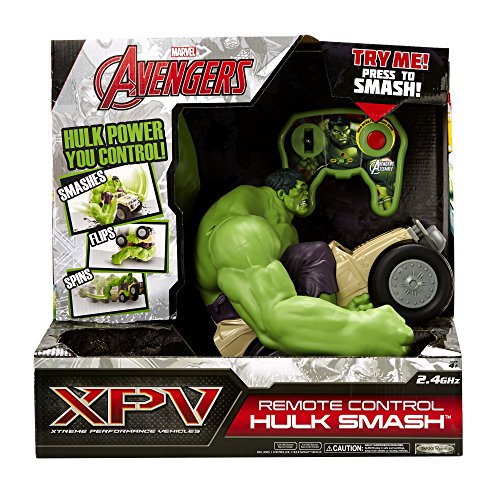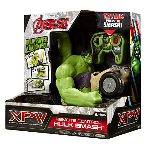 Hulk power in your hands! The RC Hulk Smash lets you control the Hulk's vehicle with smashes, flips, spins and wheelies! Go through obstacles or knock them over with Hulk's swinging arms. With Hulk's awesome power, he can flip over against walls and do high speed wheelie spins. You can even adjust the arms to 8 different positions for a variety of smashing actions. Tipping over won't stop Hulk - he'll smash his way back into driving position. Includes 10 Hulk phrases/sounds.Feature
