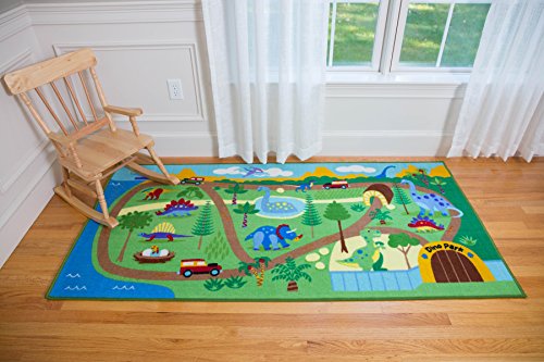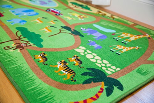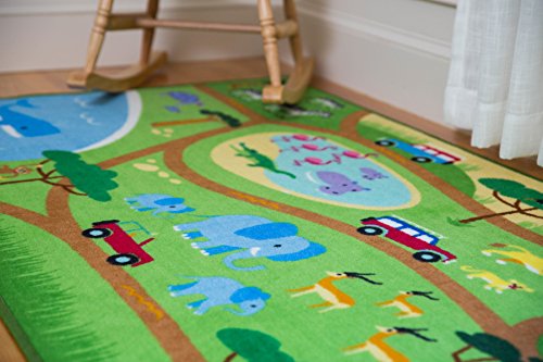 Our Safari Play Rug is designed to encourage creative play. Travel along the roads and paths through various habitats and visit an array of wild animals -lions, giraffes, rhinos, elephants, all in one fun adventure. There are hippos in the water, cheetahs in the grasslands and whales and turtles in the seas. Use your child's own collection of play cars and trucks to zoom along our colorful nylon rug for hours of creative fun. Durable, 100% nylon rug backed with non-skid latex.Feature