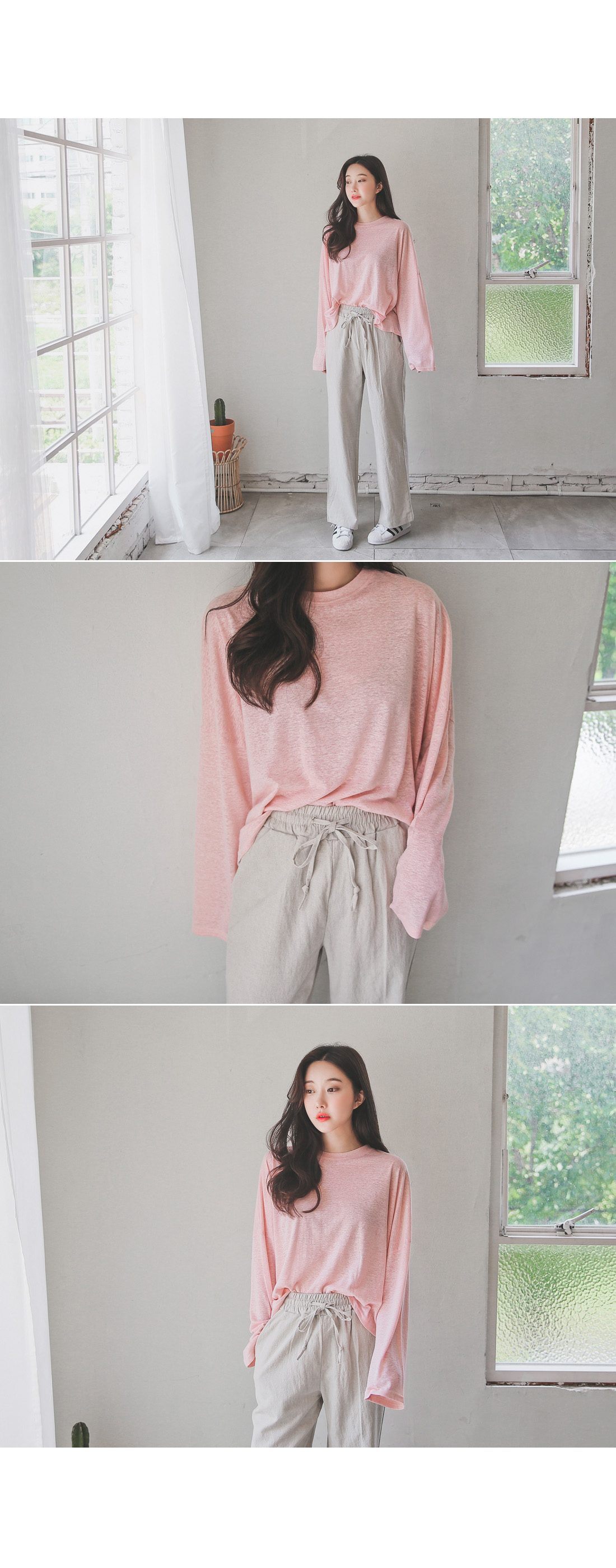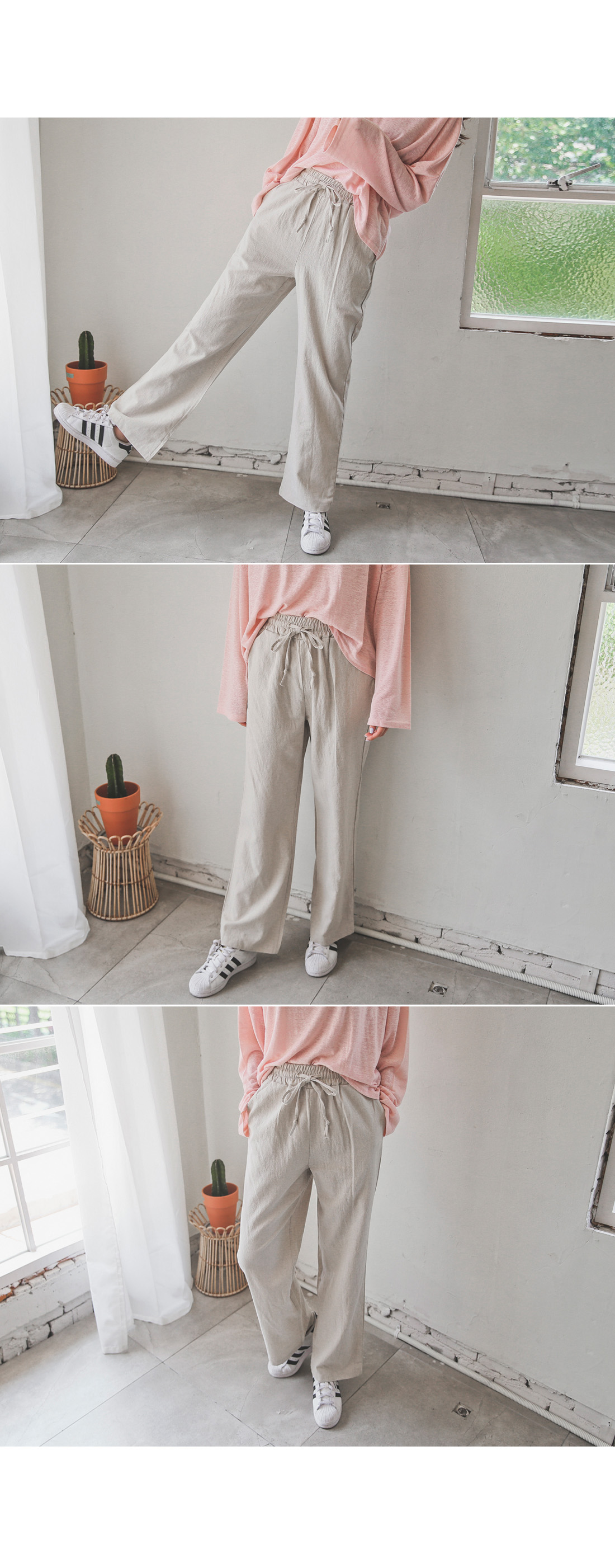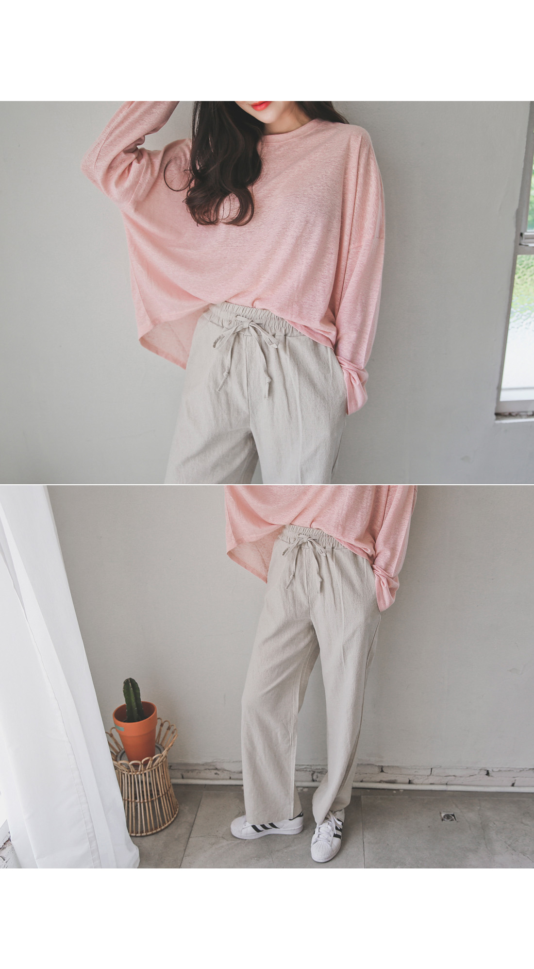 롱한 기장감의 팬츠 디자인이지만 시즌에 시원하게 착용하기