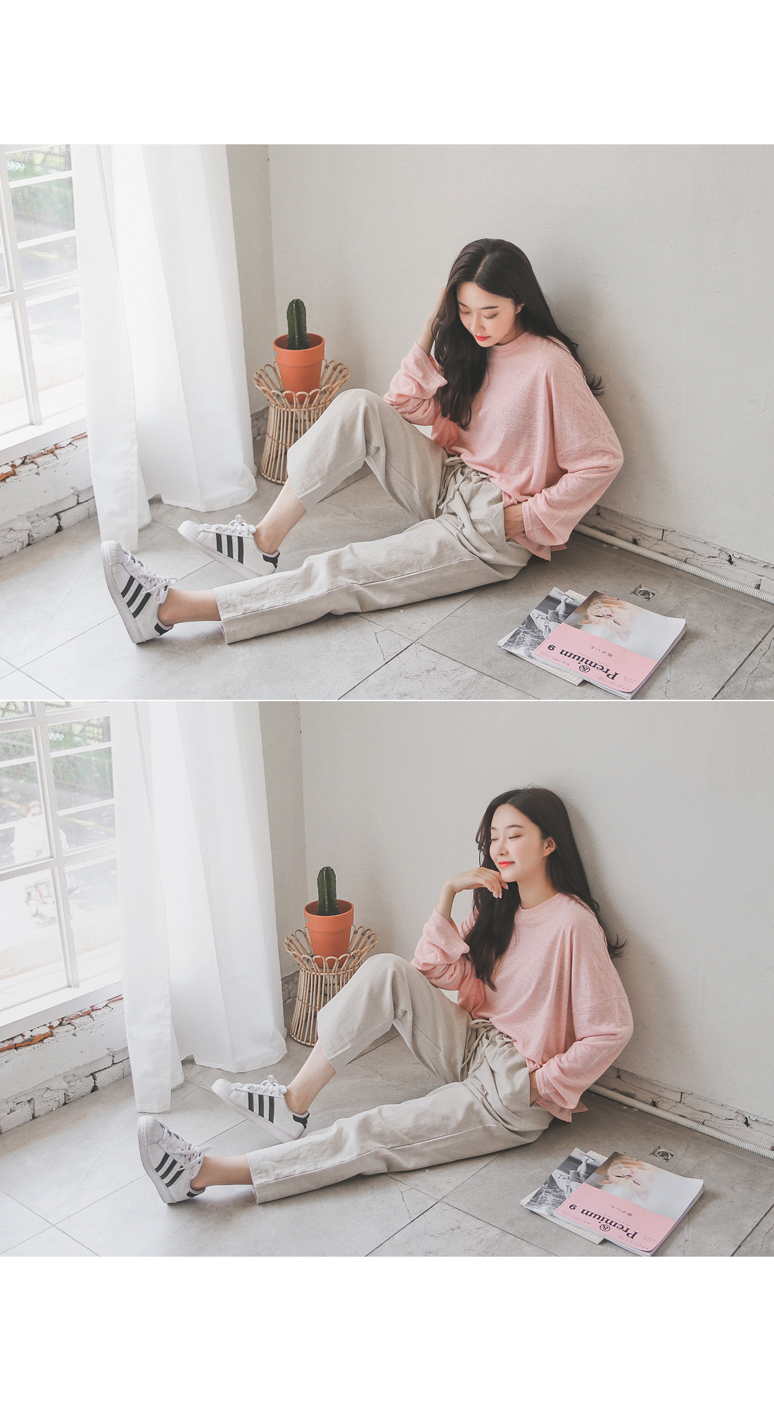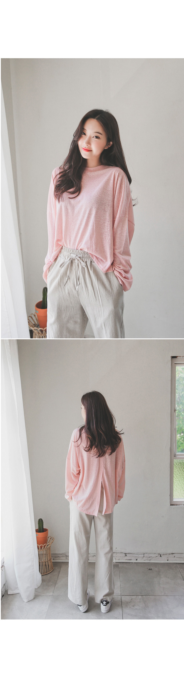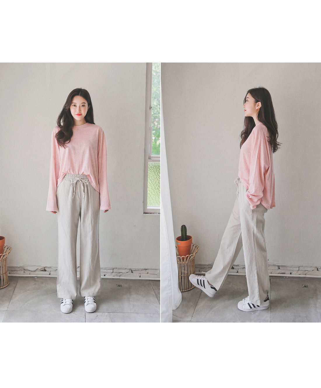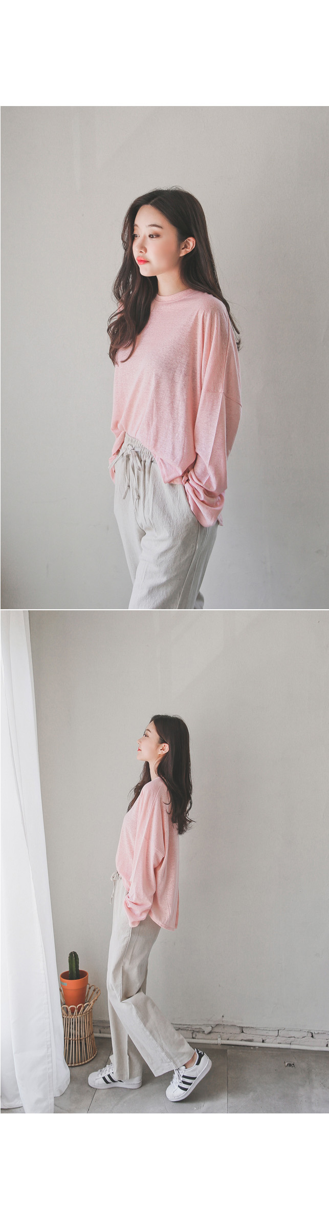 롱한 기장감의 팬츠 디자인이지만 시즌에 시원하게 착용하기