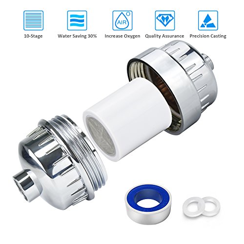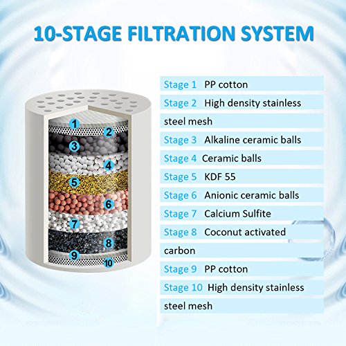 10-STAGE FILTER CARTRIDGE--Contains more purified materials to remove chlorine odor, sterilization, heavy metals, bacteria and pesticides,and inhibits the growth of algae, fungi, and mold which will promote blood circulation, relieve fatigue & stimulate the immune system.