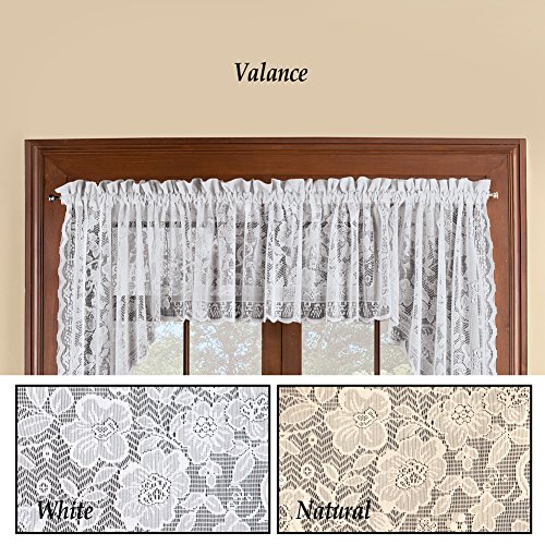 Studio : Collections Etc Publisher : Collections Etc Binding : Kitchen Product Description Floral Lace Cafe Curtain Window Valance, Windsor - With Rod Pocket Top Description This lace drapery features a floral and leaf design with scalloped edges rod pocket tops. Machine wash. Polyester; imported. Color available in White or Natural. Valance (16"L x 56"W). About Collections Etc's Window Curtains / Treatments Give your windows a custom decorator's look without the expensive price tag when you shop our unique selection of curtains, panels, tiers and valances and other window treatments. Spruce up your favorite rooms with kitchen curtains or bathroom curtains in delicate lace or sheer curtain styles.