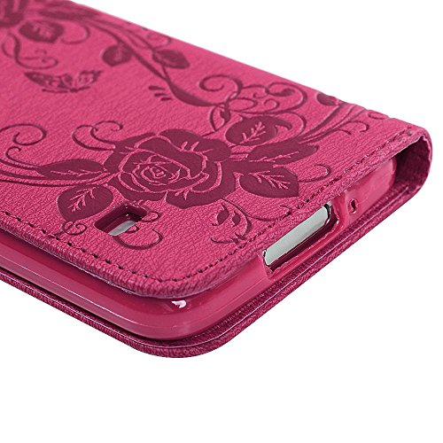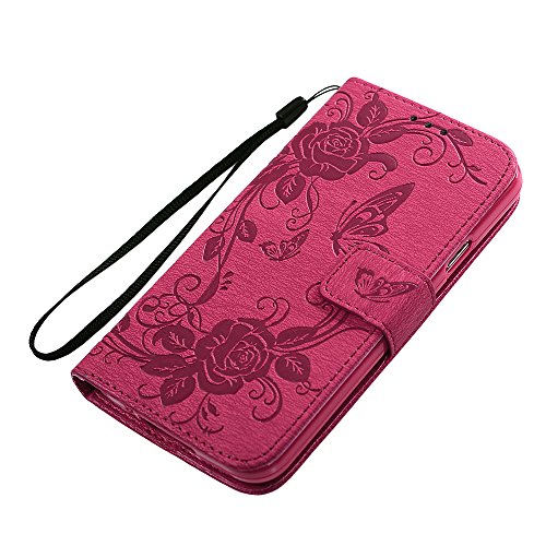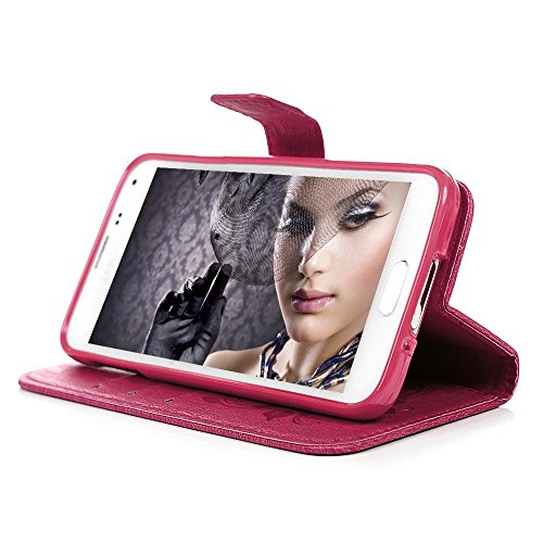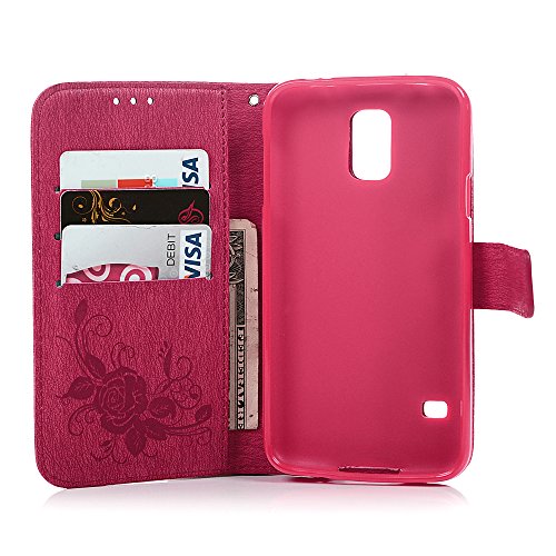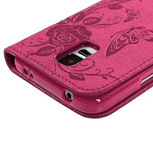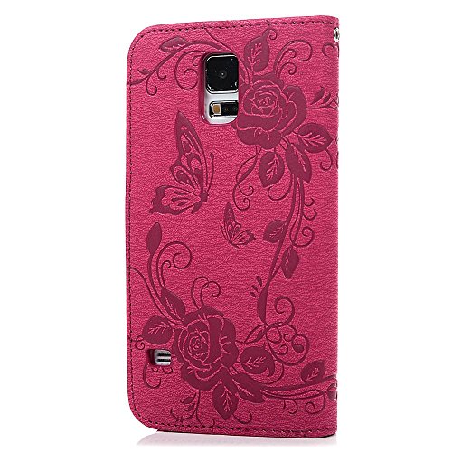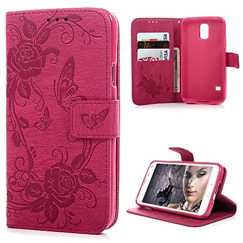 S5 Case,Samsung Galaxy S5 Case - Mavis's Diary Fashion Wallet Embossed Peonies Butterflies Premuim PU Leather Flip Folio Cover Protective Rubber Inner Case Magnetic Clip & Card Holders - Hot Pink