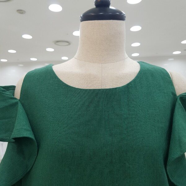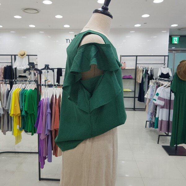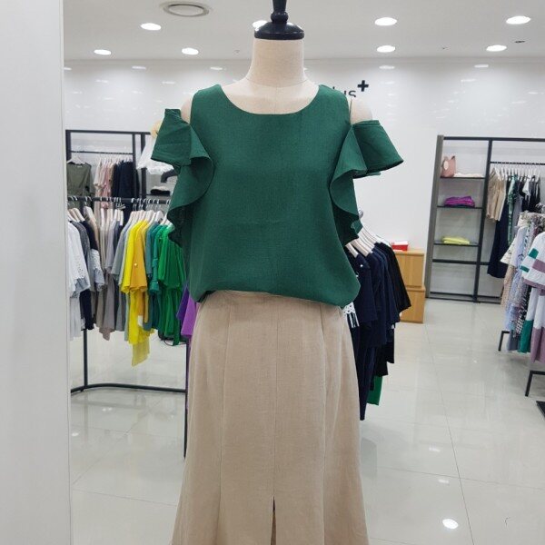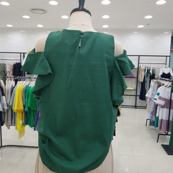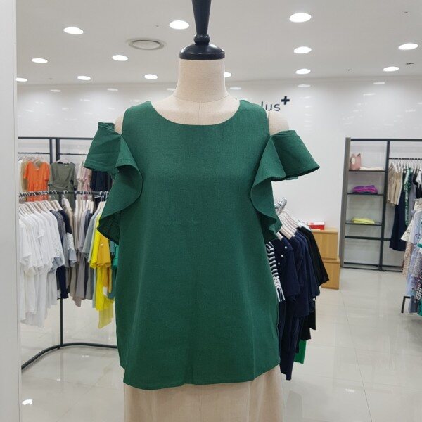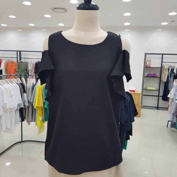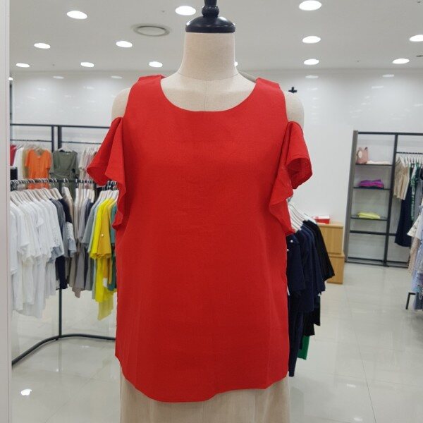 시원한 소재의 블라우스입니다.어깨 부분의 프릴 장식이 눈에 띄는 아이템이에요.