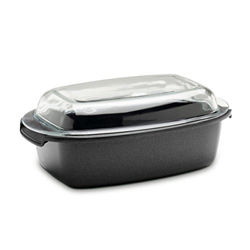 The sleek appearance of the Berndes 695964 SignoCast Multi-Purpose Roaster with Glass Lid is a welcome addition to any kitchen. A chef's dream is variety in the kitchen. This Berndes SignoCast Multi-Purpose Roaster can do it all. With a high domed lid that doubles as a casserole dish, and a triple layer non-stick coating for fat-free cooking. Roast, bake, broil and braise meats, root vegetables and more. Energy efficient with the Berndes CD bottom technology with safe side handles is a sure winning capability of this cooking masterpiece. With a size of 13 Inches by 8.5 Inches, this ultimate roaster is a dream come true!Feature