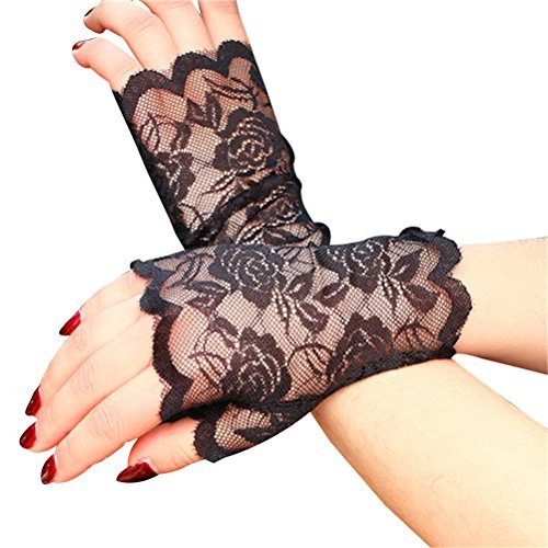 Package Including Pair of Women Lace Fingerless Gloves Half Finger Bridal Gloves UV Protection Fingerless Gloves Sunproof Gloves (Black) 0