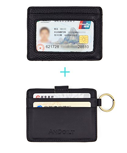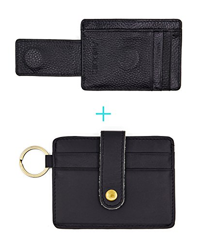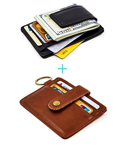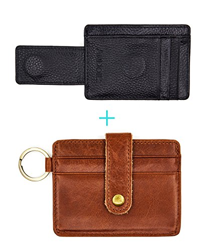 -. Feature : Wallets Material - Both wallets are made by Genuine Cow Leather. / Wallets details( pack of 2 wallets) - The first wallet, size:4.3" x 3" x 0.3",and fits nicely in your front pocket,Comes with 3 card slots, 2 larger slots and 1 I.D. holder,and with Strong Magnets to hold on to your cash. The second wallet, size:4.2" x 3.3" x 0.2",come with 5 larger slots,and with Snap Closure and Key buckle. / RFID Blocking Wallet - Keeps your vital information in cards from being stolen. Does Block 13.56 MHz Frequency (Credit cards, debit cards, driver license and ID cards); Does NOT Block 125 KHz frequency. / Light & Portable - the first wallet is extremely convenient to carry this slim wallet around in your front or back pocket.the second wallet come with key buckle and 5 larger slots, so the key and cards can be well organized in this thin wallet. / Comes with a 1 year replacement guarantee.
