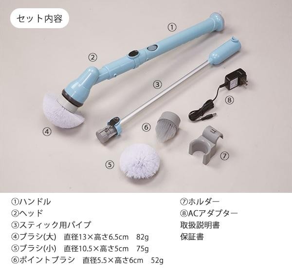 | セット内容 | ハンドル、ヘッド、スティック用パイプ、ブラシ(大)、ブラシ(小)、ポイントブラシ、ホルダー、ACアダプター、取扱説明書、保証書(1年間※ブラシは消耗品のため保証適用外です) |