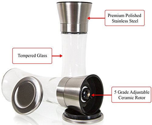 ADJUSTABLE GRIND SETTING-our salt and pepper shaker set features an adjustable grinder, which allows you to finely crush, mill and grind your spices to perfection, and to your satisfaction. NOTE: Salt and pepper are NOT included.