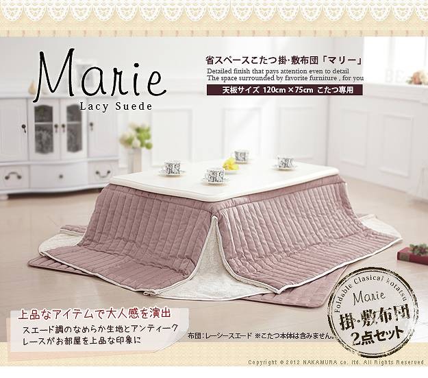 商品について:省スペースタイプのこたつ掛布団+敷布団のうれしい2点セット。掛布団の裏地にはふわふわのシープボア、ベースには起毛加工を施したマイクロスエードの生地を使いなめらかな肌触りに☆コーナー部にはレースをあしらってエレガントでガーリーなテイストに仕上げました♪掛布団(洗濯可)、敷布団(ドライ)