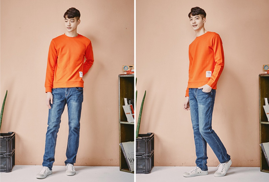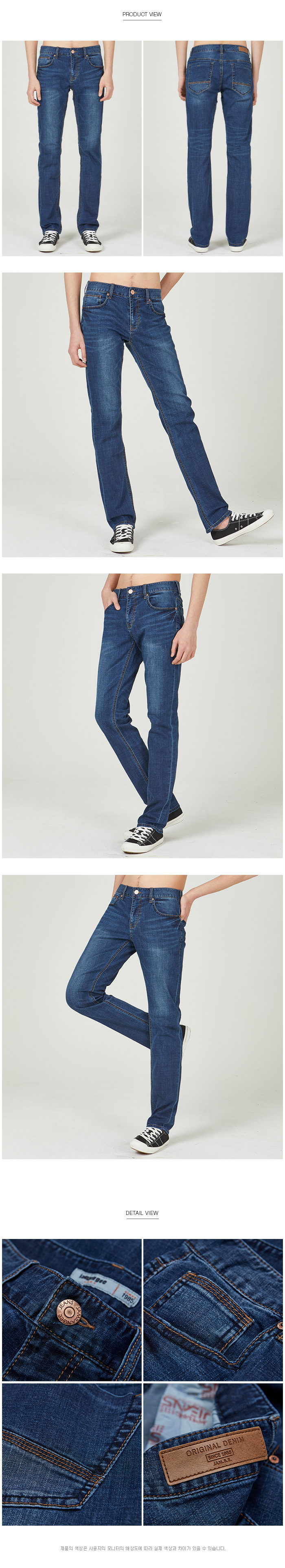 저렴한 가격대의 기획 제품으로 이번시즌 처음으로 L톤의 밝은 인디고 컬러에 캣브러쉬 워싱 남성 SN핏 데님 스타일