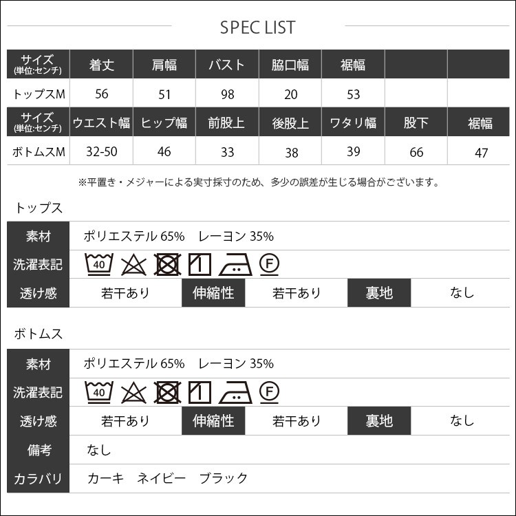 ボトムス:ウエスト幅 32-50cm ヒップ幅 46cm 前股上 33cm 後股上 38cm ワタリ幅 39cm 股下 66cm 裾幅 47cm
