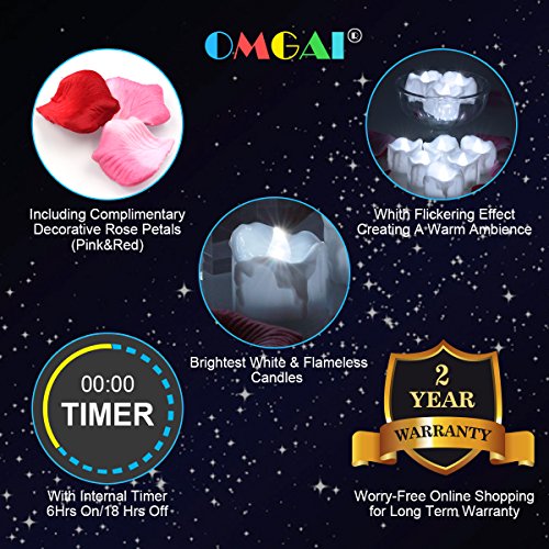 ★ 2 Years Warranty: 90 Days 100% Satisfaction Guarantee and Our Friendly Service - 24 hours email customer service response. Package including: 24pcs Tea Lights and Complimentary Faux Rose Petals.