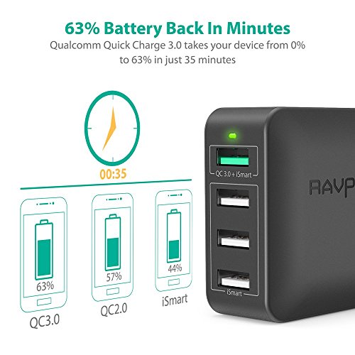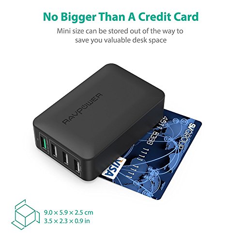 USB Quick Charger RAVPower 40W 4-Port Fast Charger Desktop Charger Charging Station with Quick Charge 3.0 for Galaxy S7/S6/Edge, Note 5 and iSmart for iPhone 7/6s/Plus, iPad, LG, Nexus 6, HTC & More