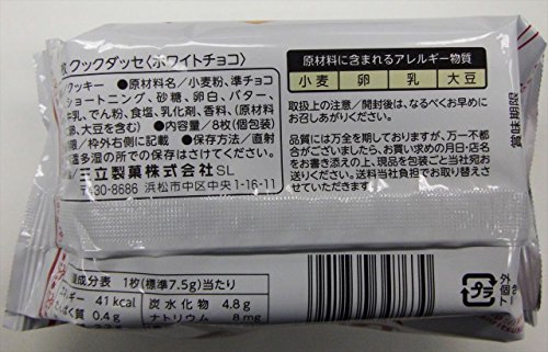 原材料:小麦粉、準チョコレート、ショートニング、砂糖、卵白、バター、水あめ、牛乳、でん粉、食塩、乳化剤、香料、(原材料の一部に卵、大豆を含む)