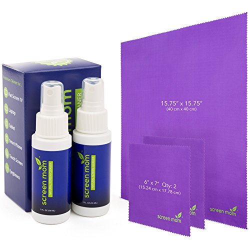 Feature : Includes 2-2oz spray bottles, 1-Purple 15.75"x 15.75" and 2-Purple 6"x7" Microfiber Premium Cloths, A Great Gift idea / Safe and Natural - Plant based product with no odor, alcohol, ammonia, or harmful phosphates; safe to use around family and pets / Streak Free - ScreenMom gives your screen a like new appearance again that you will love / Gently Cleans - HDTVs, PC monitors, Kindle,Tablet, Laptops,Glasses,Poly-Carbonate Sunglasses, Smartphone display,Apple Mac Products / Product Tested - on all major brands