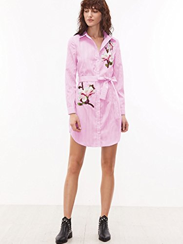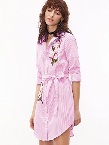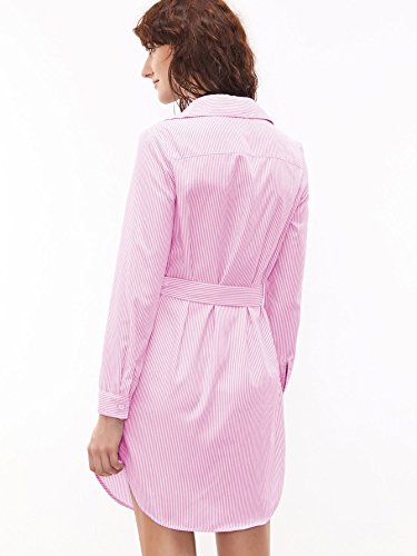Long sleeve, pinstripe vertical striped, self belted, button down collar, mini
