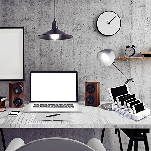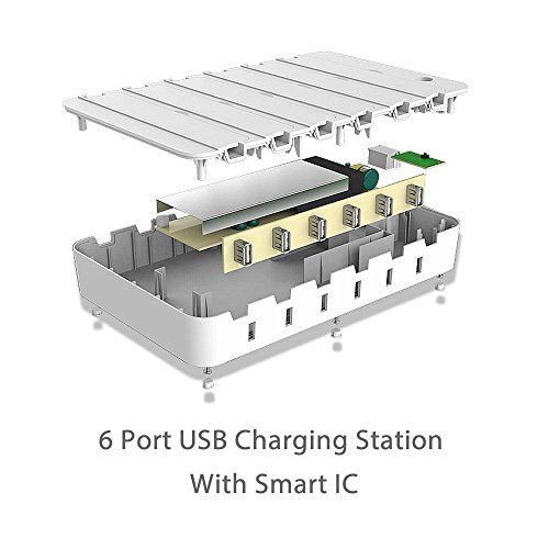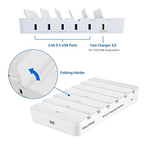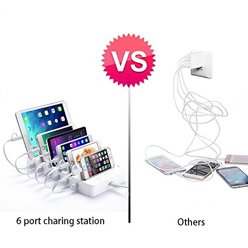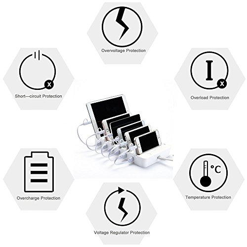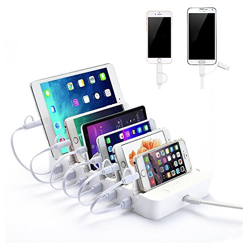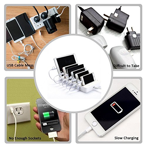 HILLPOW 60W 6 Port Universal Multiple Charger Smartphone Charging Dock with 2 in 1 USB Charging/Sync Data Cable for iPhone iPad Galaxy C2 (White)