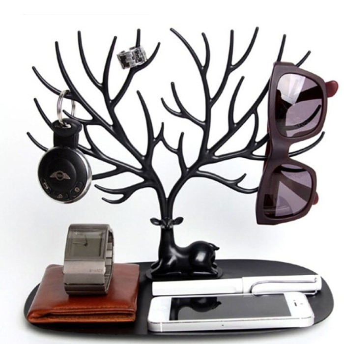 送料無料でお届けシカの角に宝石類をディスプレイできる、とてもオシャレなジュエリースタンド。 飾って収納できるので、収納アイテムとしてはもちろん、お部屋のインテリアとしても大活躍。 鹿のツノ部分にはお気に入りのネックレス、ブレスレットなどをかけていただけます。 下部のお皿、プレート部分には財布、時計、スマホ、化粧品などを置けるスペースとなっております。 アクセサリーはもちろん、玄関に置けば鍵などの小物類もきれいに片付けできます。 素材:プラスチック サイズ:高さ約22cm x 横約25cm x 奥行約15cm