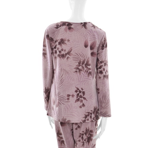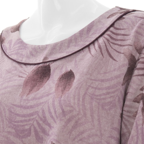 핑크 바이올렛 계열에 와인색 플라워 나염이 흩뿌려진 편안한 실루엣의 이지웨어 제품입니다.