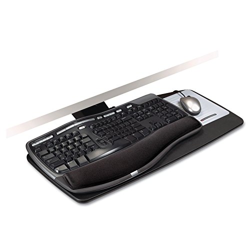 -. Feature : Sold as 1 EA. All-in-one keyboard platform with 5-1/2" height range, 360 swivel and +15/-15 tilt. / Easy height and tilt adjustment; just loosen knob, position tray as desired, then re-tighten knob. / Mousing surface can be positioned right or left. / Full-width leatherette gel wrist rest with antimicrobial product protection. / PreciseTM mousing surface extends battery life.