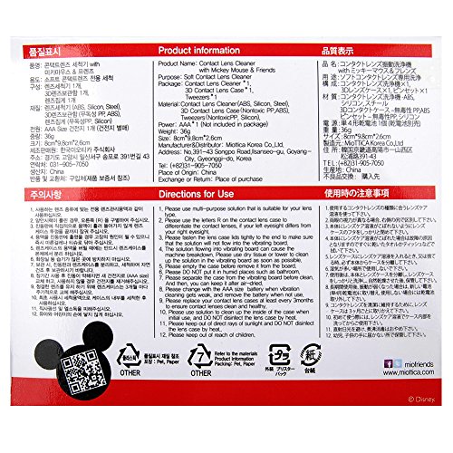 Studio : MioTTiCA Publisher : MioTTiCA Binding : Health and Beauty Product Description MickeyMouse Friends Contact Lens Vibration Cleaner is an officially licensed product of Disney. The cleaner is to remove completely the protein of the contact lens in three minutes by a fine vibration. MioTTiCA products are handmade, non-toxic ABS PP, paint-free, non-adhesive products. Compatible with: MickeyMouse Friends Contact Lens case Soft lenses, hard lenses, circle lenses all available (AAA batteries not included.) 0