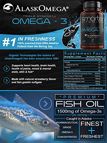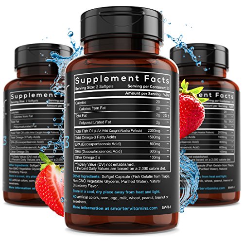 SmarterVitamins Omega 3 2000 mg per serving 1500 mg Omega 3's per serving Fish Oil is formulated with AlaskOmega Fish Oil. Strawberry Flavored. Fish 1000 mg Softgels.
