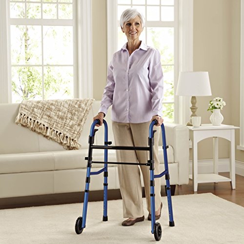Studio : Medline Publisher : Medline Binding : Health and Beauty Product Description Stylish blue color gives this walker some real personality. Walker comes with paddle folding mechanism for easy operation. Walker can be folded by either pulling up or pushing down on the ergonomically designed paddles! Legs also fold up making it perfect for transportation or storage. Model comes with both extension legs and the 5" wheels in one retail box. Fits users 5'5" to 6'4". 0
